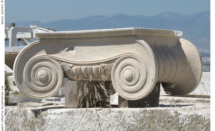 | It is difficult to be absolutely sure, but the Ionic capital of the south corner of the west porch of the Athena Nike temple (left in the photo above) looks very much like the capital in the photo a little further up the page, taken in 2007. |