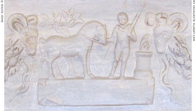 To his left a warrior, perhaps a servant or groom, in full armour and with a shield, holds his horse. The figure's armour has been compared to the type shown in the reliefs of the Athena Sanctuary on the Pergamon Acropolis (see gallery 2, page 20 and page 21).