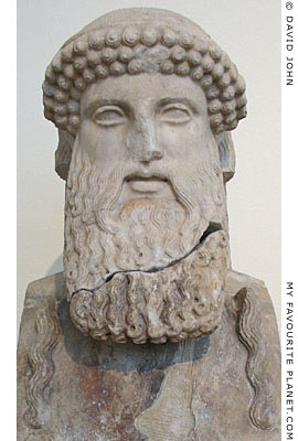 The similarities between the head of this herm and that of the Pergamon herm are immediately apparent. Unfortunately, only three fragments of the upper part of the shaft has survived, so if there was an inscription it has been lost. Parts of the side locks are missing, and some of the curls, the nose and beard have been damaged. Orange, red and black colouring can be seen on beard and breast. Despite the famed whiteness of Pentelic marble, this sculpture now looks decidedly grey. |