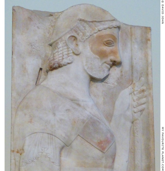 Detail of the relief of Aristion. The carving of the hair, beard and folds of the sleeve are particularly fine and detailed. There is a lightly sculpted star on the