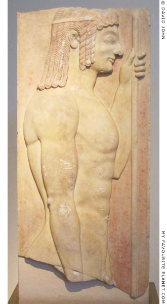 Fragment of an Archaic Attic gravestone with a painted relief of young doryphoros (spear carrier), facing right, on a red background.