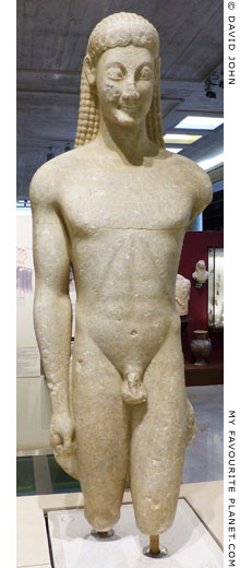 The base of one of the twin marble kouroi statues known as "Kleobis and Biton", excavated at Delphi and dated to around 580 BC, is inscribed with an artist's signature, the first letters of which are no longer legible:
