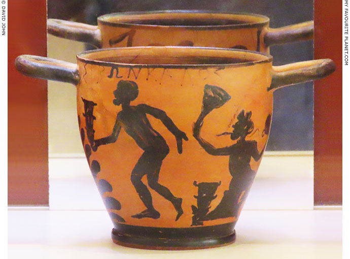 A black-figure column krater from Eion, near Amphipolis, Macedonia. Made in a local workshop in imitation of Attic pottery. Late 6th century BC. On Side A a painting of a group of komasts
