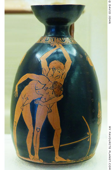 A shoulder type lekythos found in Kerameikos, Athens, with a depiction of wrestlers (see photo below). Kerameikos Archaeological Museum. Inv. No. 25829.