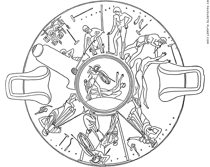 A drawing of the outside (Sides A and B) of the "Berlin Foundry Cup", an Attic red-figure kylix (drinking cup), made in Athens 490-480 BC.
