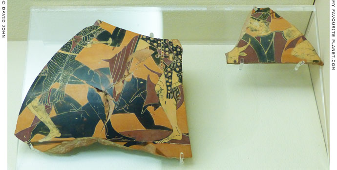 In the Kerameikos Archaeological Museum, Athens (see photos below): fragments of a black-figure plate with a depiction of mourning males, Inv. No. 1909; fragments of a black-figure bowl with a depiction of mourning males; fragments of a black-figure vessel with a depiction of an Amazonomachy.