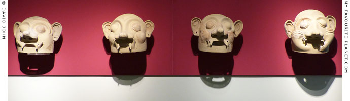 The four terracotta masks from Tiryns displayed in Nafplion Archaeological Museum. |