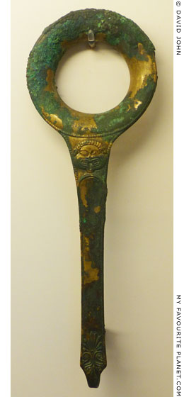 The strainer's ring has a relief of the river god Acheloos, but it is almost impossible to discern the figure on the corroded object.