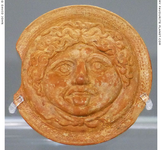 A small terracotta Gorgoneion, as a votive offering at the rural sanctuary of the Chthonic deities to the west of Orchomenos (Ὀρχομενός), Boeotia, central Greece.