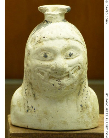 Archaic flask in the form of a Gorgon bust with traces of colour.