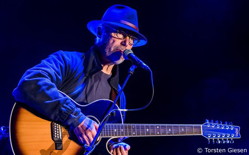 Hugh Featherstone on stage with his trusty Washburn 12-string guitar.